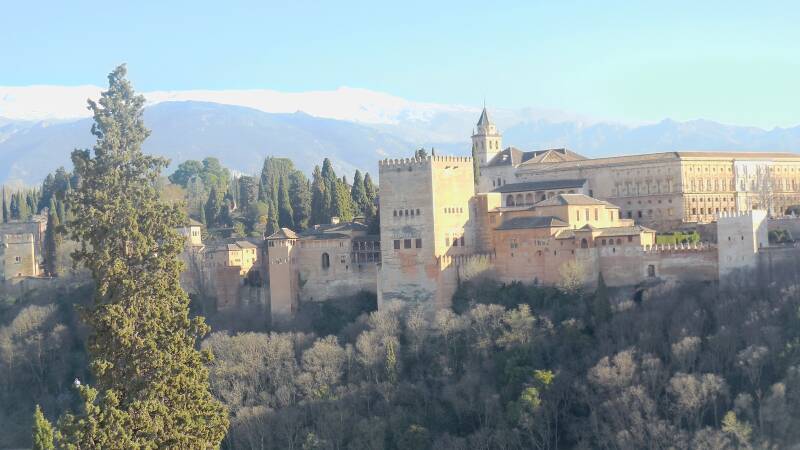 Del av Alhambra med snöklädda Sierra Nevada i bakgrunden. Foto: Budgetres