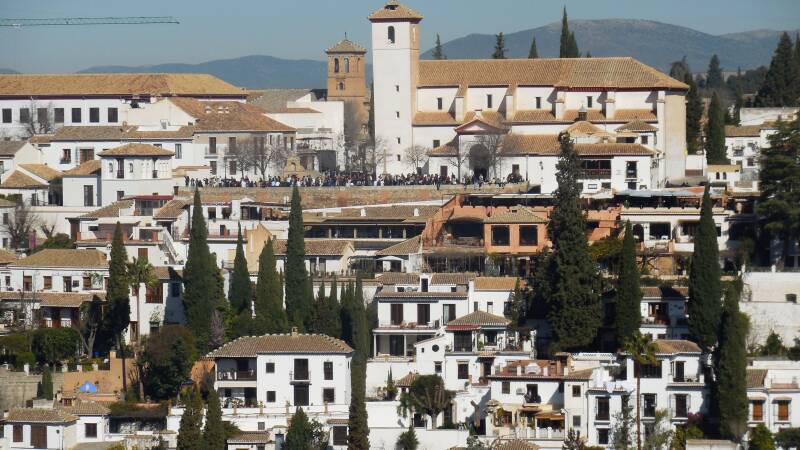 Utsikt från Alhambra mot Albaicín. På torget Mirador de San Nicolás, ser de över till oss. Foto: Budgetres.