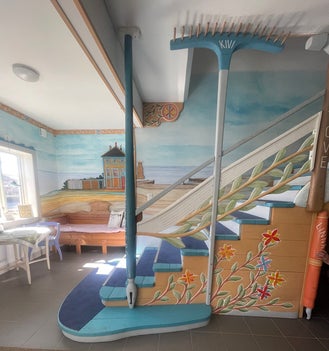 Vi njuter av att bo här i en kopia av en finsk stormansgård. Här är det fina målningar och träarbeten på väggarna och rumsdörrarna är utsmyckade på olika sätt. Du kan se bilder från de olika boendena här.
